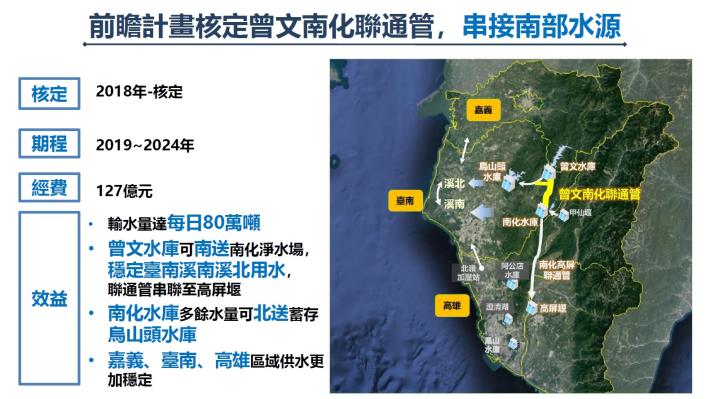 黃偉哲市長表示,面對極端氣候影響,本市曾文-烏山頭水庫及南化水庫110年及112年面臨無颱風降雨不足且不均、長時旱象之挑戰,致常有該一水庫有餘、另一水庫吃緊之供水瓶頸,在在顯示當今單一水庫供水系統面對極端氣候應變能力有限;,如今曾文南化聯通管啟動通水,串聯曾文、南化水庫,也串接南化高屏聯通管,建立了南部地區各重要水源供應系統之調水通道,也打通本市水源的任督二脈!