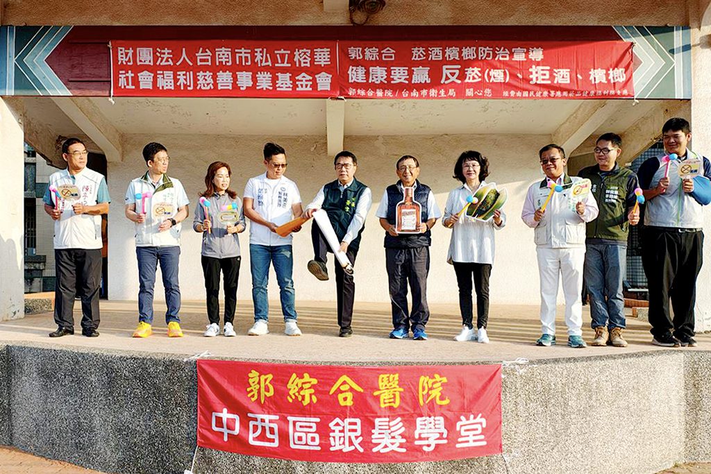 ▲總裁郭宗正、鄭雅敏與衛生局主秘陳淑娟、安平國中校長陳柏蒼及民意代表和黃偉哲市長共同宣導拒絕菸、酒、檳榔。