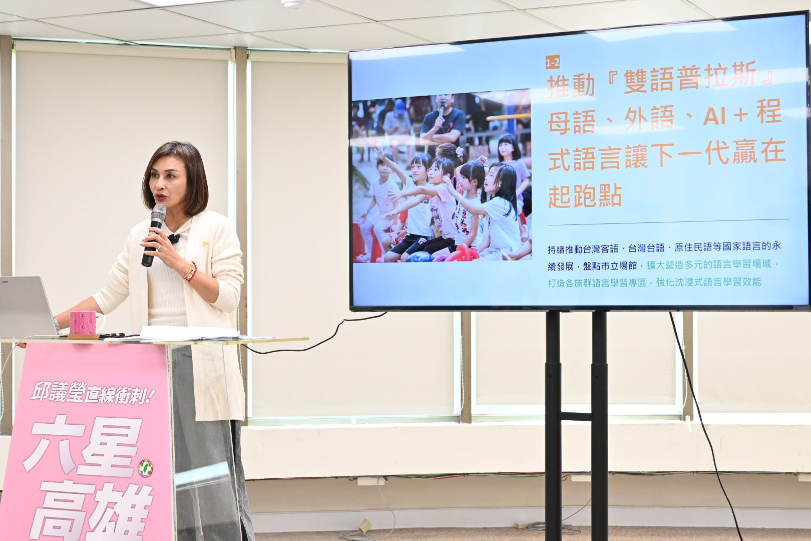 邱議瑩並主張「雙語普拉斯」,說明在母語及外語的雙語教學基礎上,結合AI及程式語言教育,讓孩子從小能夠用世界的語言,說自己的故事,與國際接軌,成為國際級人才;透過學校與社團課程,讓高雄的下一代熟悉母語、理解外語、會用程式語言,從小開始贏。