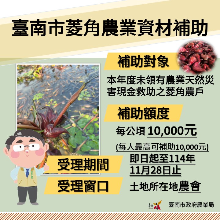 受7月風災及西南氣流影響,臺灣中南部地區遭逢顯著持續性的強降雨。然部分菱角田區未達天然災害現金救助門檻,惟農民仍反映依菱角生長特性,後續衍生遲發性災損,田區後續恐有減產問題。市長黃偉哲為減輕農民損失,積極爭取補助農民生產所需資材,以減少農民損失。獲農業部同意補助菱角農民購買石灰等資材費用,每公頃最高1萬元,凡符合未領有農業天然災害現金救助之菱角受災農戶,請於11月28日前,盡速向土地所在地區農會提出申請。