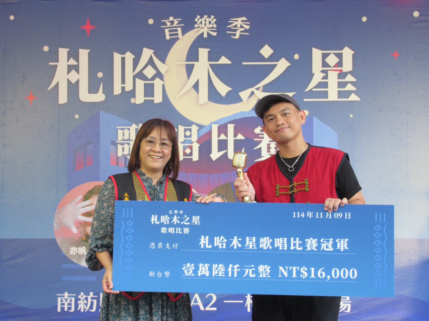 臺南市政府原住民族事務委員會114年11月9日(星期日)下午1時至晚間8時,在南紡購物中心A2館一樓南紡廣場舉辦「札哈木音樂季-札哈木之星歌唱比賽決賽」。8位優秀決賽選手展開精彩的歌唱對決,角逐「札哈木之星」冠軍寶座。林俊憲立法委員、施余興望Tjakumay Tagaw議員服務處均派員到場致意,東光里劉金幸里長也親臨現場,共同參與這場盛事。