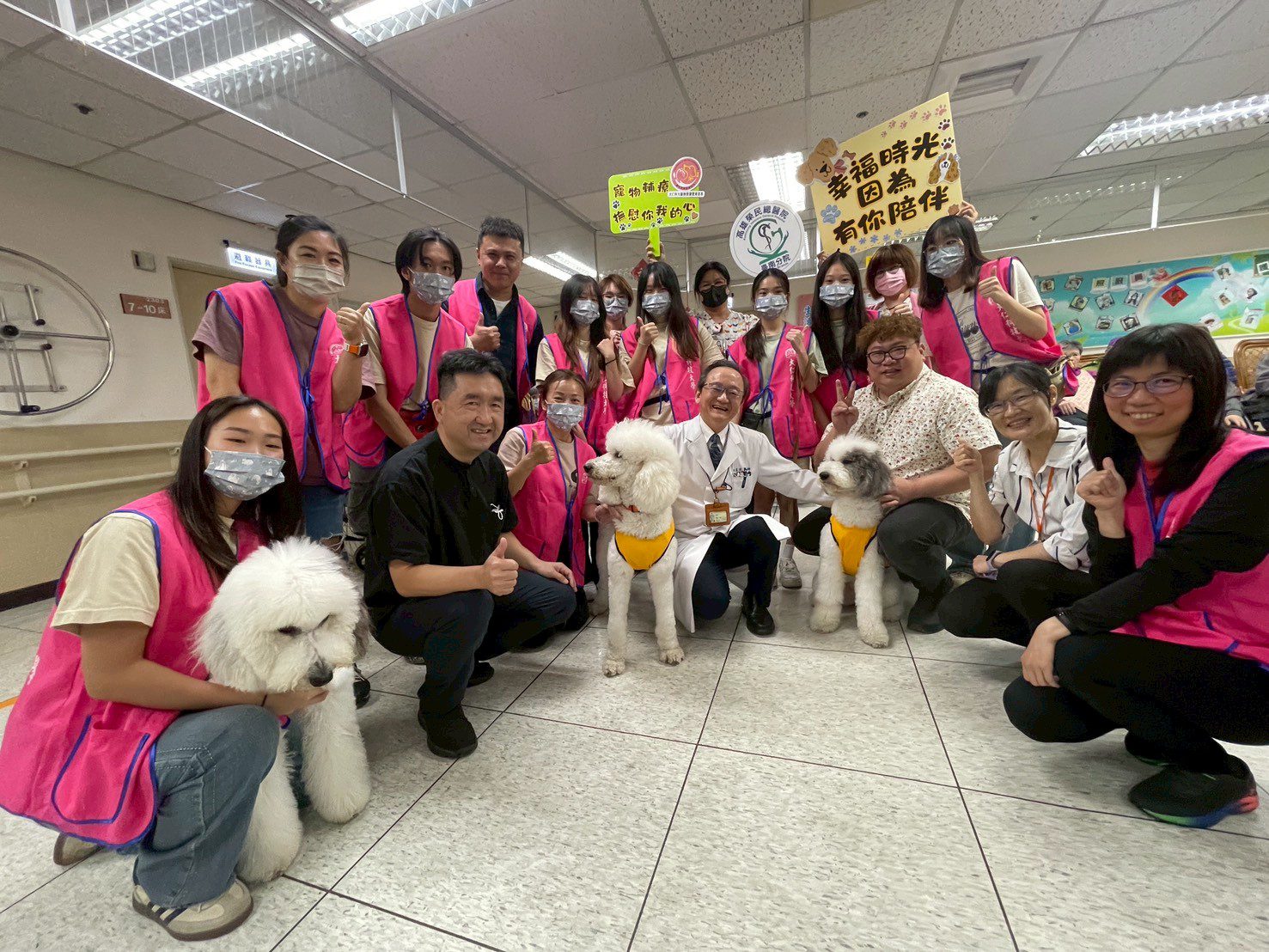 大仁科技大學寵物照護暨美容系於 11/18 日前往高雄榮民總醫院台南分院精神與一般護理之家,辦理動物輔助活動(AAA),由三隻訓練完善的貴賓犬 ORIO、寶兒與斑斑,以及 8 位學生組成團隊,為長者帶來溫馨療癒的互動體驗。