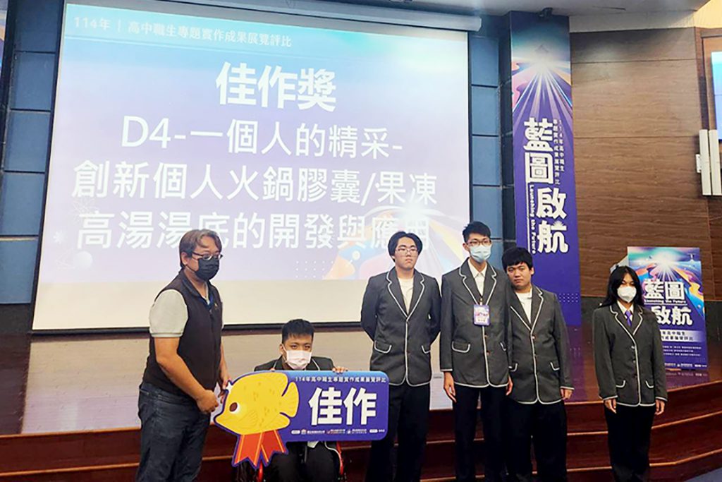 【記者吳玉惠/臺南報導】 育德工業家事職業學校餐飲技術科學生於 11 月 21 日前往國立高雄科技大學參加高教技職技優教育精進聯盟專題競賽,以作品《一個人的精彩-創新個人火鍋膠囊/果凍高湯湯底的開發與應用》在眾多隊伍中脫穎而出,榮獲佳作,展現學生在技職教育中累積的實力與創意。