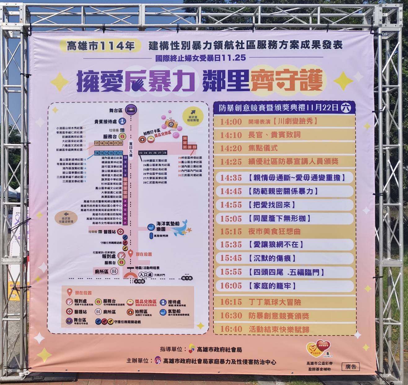 【記者 周志杰/高雄報導】每年的 11 月 25 日,是聯合國宣布的「國際終止婦女受暴日」,全球各地皆以不同方式呼籲終止性別暴力。高雄市政府社會局家防中心於 22 日在衛武營都會公園夏日大道舉辦年度宣導暨成果發表活動,以「擁愛反暴力,鄰里齊守護」為主題,串連跨局處與社區力量,共同展現防暴教育深耕在地的成果。超過 800 位市民親子熱情參與,在遊戲、互動與儀式中共同凝聚守護力量,讓愛成為社區最溫暖的屏障。