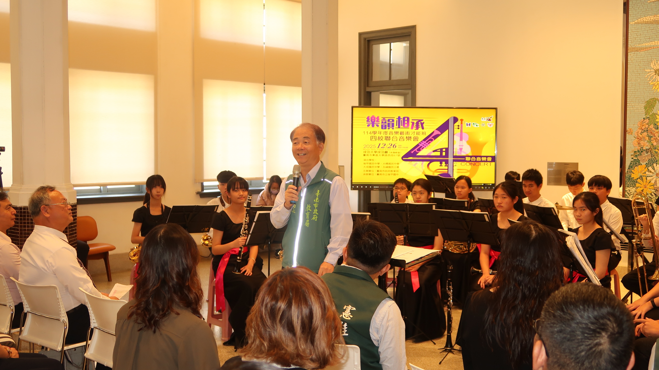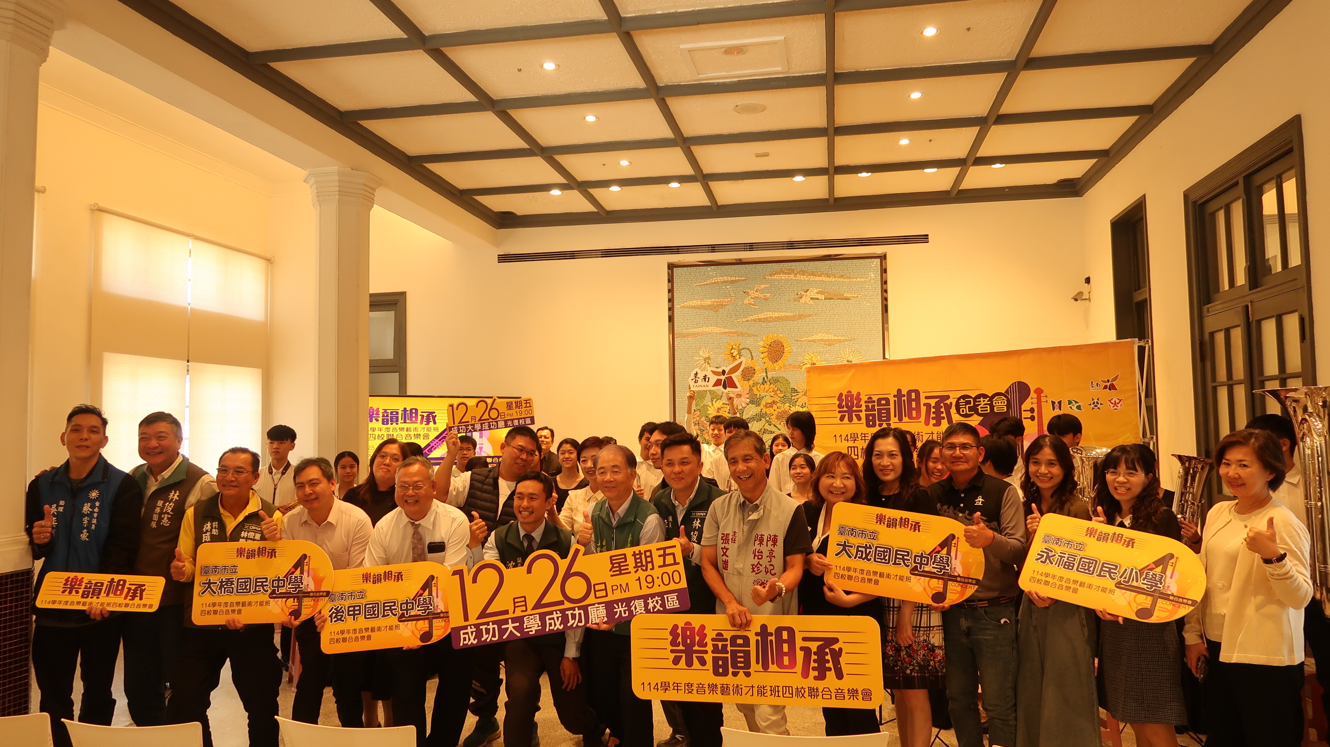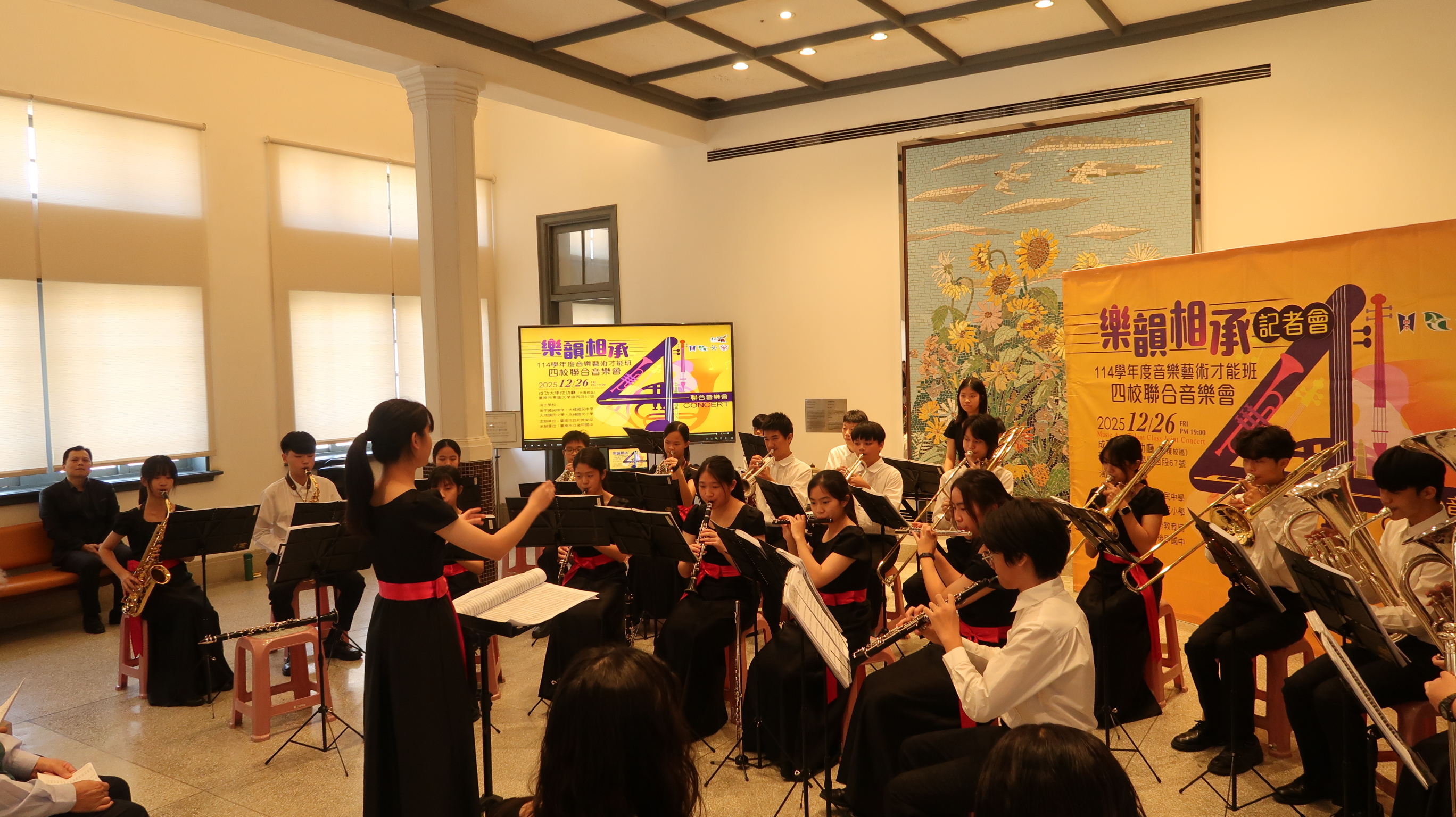 「樂韻相承」─臺南市114學年度音樂班四校聯合音樂會將於114年12月26日(五)下午7時在國立成功大學成功廳由後甲國中、大成國中、大橋國中及中西區永福國小4校舉辦。今(11)日在臺南市美術館1館大廳舉辦宣傳記者會,由後甲國中音樂班表演為活動暖場,邀請民眾共襄盛舉,欣賞南市溪南區音樂班孩子們演奏之音樂藝術饗宴。