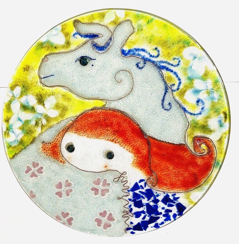 這些物件進入窯燒琉璃畫後,和小女孩、動物形成意想不到的組合。圓形畫面像星球,也像未被戳破的泡泡,柔軟卻帶著一絲未知的緊張感。「世界本來就是脆弱的,但脆弱也很美。」她補充。
