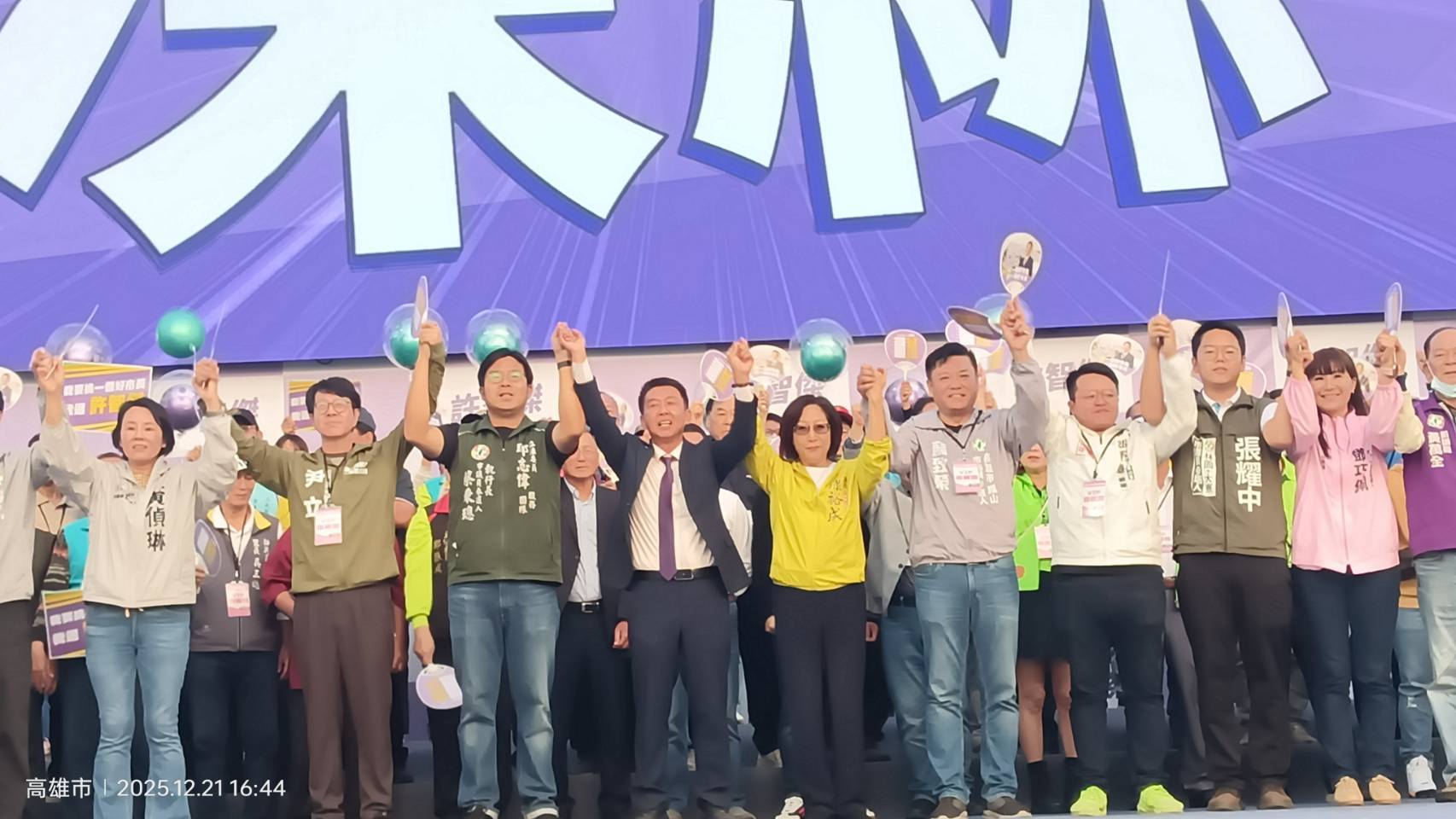 【記者蘇莉湘 / 高雄報導】 立法委員許智傑今日在鳳山舉辦首場造勢大會,邀請立委邱志偉、楊曜、李柏毅和農業部前部長長陳吉仲助講,金曲歌后黃妃、歌王翁立友演唱,也有許的國小、國中同學、高中、大學等同學拍影片訴說當年對許的印象,許智傑在活動尾聲大進場時,眾人齊聲喊「挑一個好市長,許一個好未來」、「智慧高雄、傑然不同」,並由翁立友帶領眾人合唱。