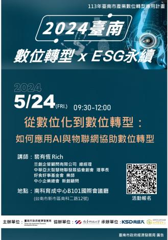 臺南市政府經濟發展局為推動數位轉型,於5/24上午9點聯合南臺科技大學和南科育成中心共同舉辦題為「從數位化到數位轉型:如何應用AI與物聯網協助數位轉型」的第一場數位轉型推廣活動!
