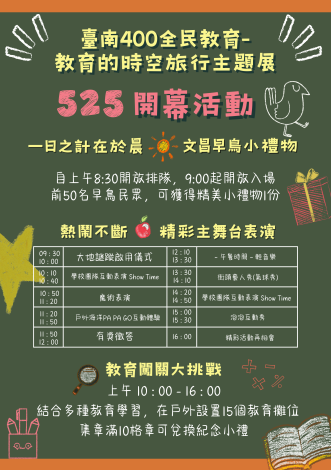 「臺南400全民教育-教育的時空旅行」主題展將於5月25日在南市兒童科學館正式開幕,展期至9月1日,臺南市長黃偉哲邀請全國民眾免費參觀。開幕當日還特別準備神秘早鳥好禮、熱鬧舞台和教育主題闖關活動,讓參觀的來賓深度感受臺南的教育軟實力。