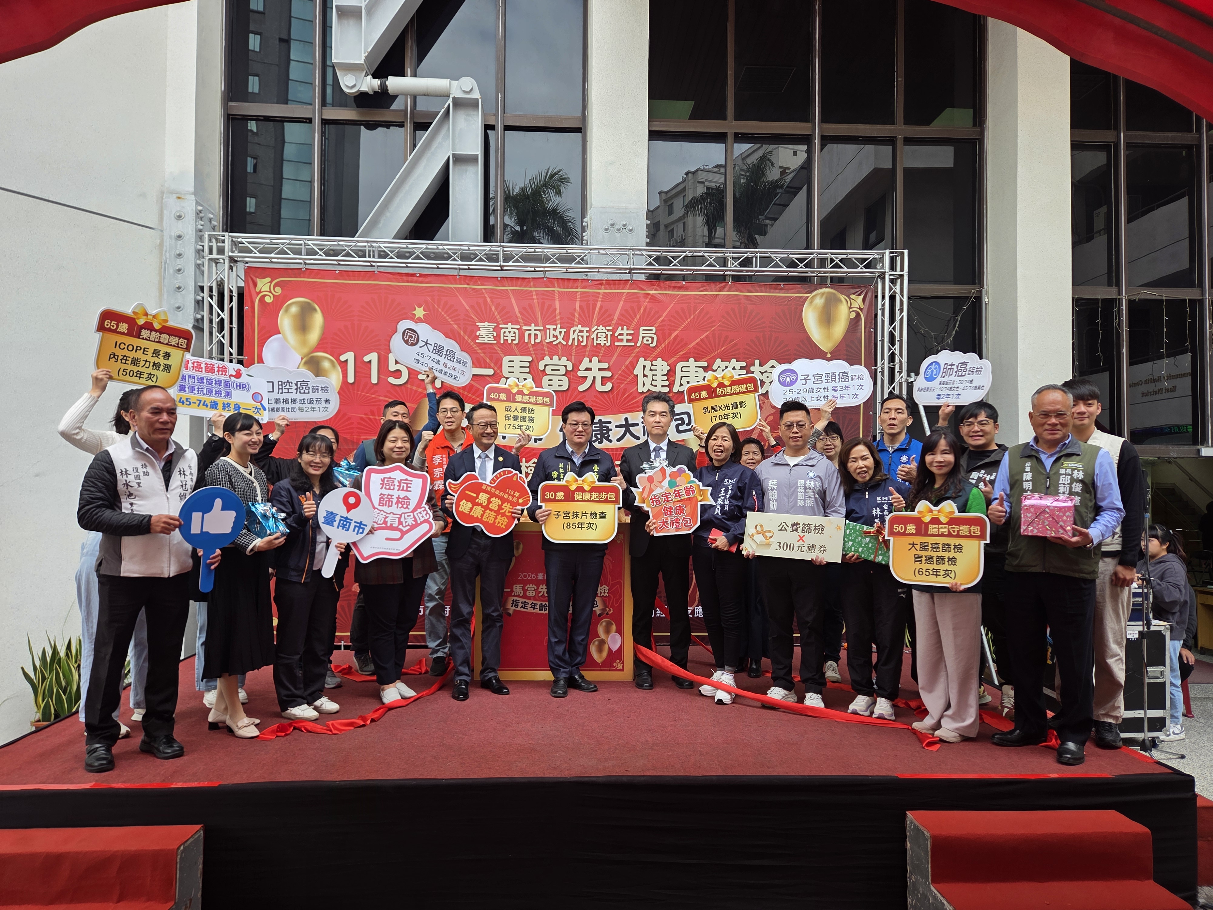為守護市民健康,打造高齡友善的健康台南,臺南市政府衛生局於今(12)日舉辦「一馬當先,健康篩檢」大禮包記者會。副秘書長徐健麟代表市長黃偉哲出席啟動大禮包儀式,並於現場揭曉趣味的「健康大禮包刮刮卡」,象徵刮出健康,號召指定年齡的市民朋友「一馬當先」預約篩檢,完成篩檢即可登記領取300元禮券大紅包!現場有提供子宮頸抹片、乳房X光攝影、大腸癌篩檢服務,民眾參與熱烈現場篩檢數已完成超過 250 人次。
