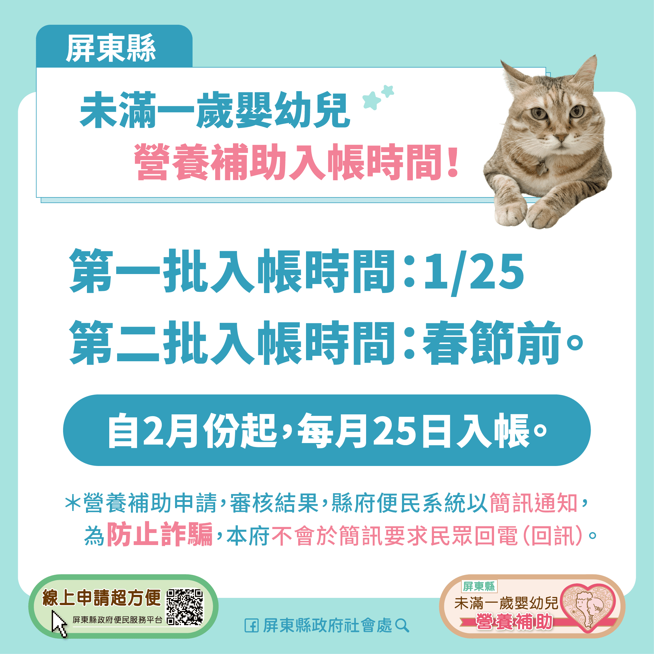 【記者范家豪/屏東報導】   為減輕家庭育兒負擔,屏東縣政府自115年1月1日起開辦未滿一歲嬰幼兒營養補助,因採全面線上申請便民服務,經查系統發現去(114)年12月31日一跨完年,便已經開始收到民眾申請案,截至今日已收到逾2千件申請案,顯示民眾申請非常方便及踴躍,社會處因應民眾需求,已緊急調度人力加速審案,原計畫每月25日核撥當月1日至15日申請案,16日至月底申請案則於次月25日撥款;今因1月申請案十分踴躍,本府於1月25日將先行核發審查通過約1千案,另為避免民眾久候,在春節前還會再核發一批1月份其餘通過案,2月份起則固定於每月25日撥款。