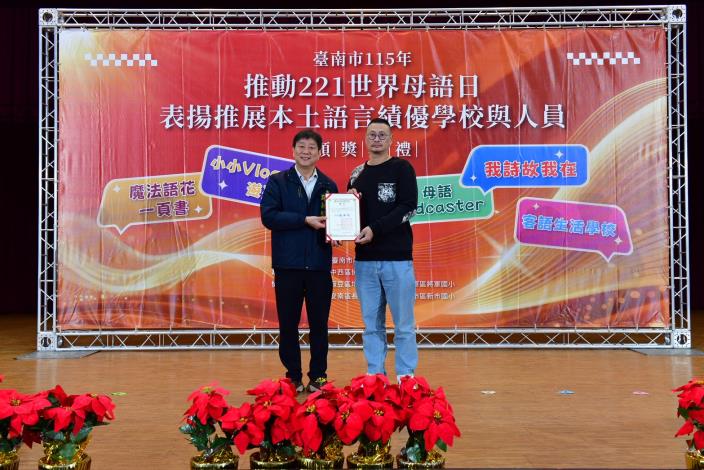 典禮中表揚多位表現優異的學生,其中西港國小於「小小Vlogger遊臺南」競賽中表現亮眼,學生以母語入鏡走讀「西港八份」,透過影像紀錄家鄉故事,展現母語應用與在地文化的緊密連結。新市國中學生韓景淮則以新詩作品《行!咱作伙來去 Fata’an》榮獲「我詩故我在」競賽第1名,作品記錄花蓮地震期間民眾彼此扶持、自願當「鏟子超人」的歷程,細膩呈現台語文學所承載的情感與記憶。