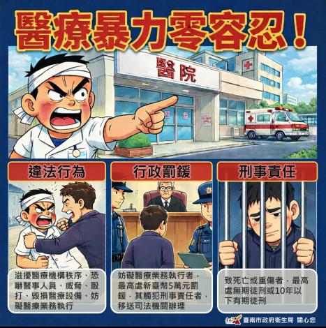 醫療機構是守護民眾生命健康的神聖殿堂,醫事人員更是在第一線與病魔搏鬥的英雄。然而,過往發生的醫療暴力事件,不僅傷害了醫護同仁的身心健康,更嚴重干擾正常的醫療秩序與患者服務。臺南市政府衛生局今(21)日重申,對於任何形式的醫療暴力絕對秉持「零容忍」態度。