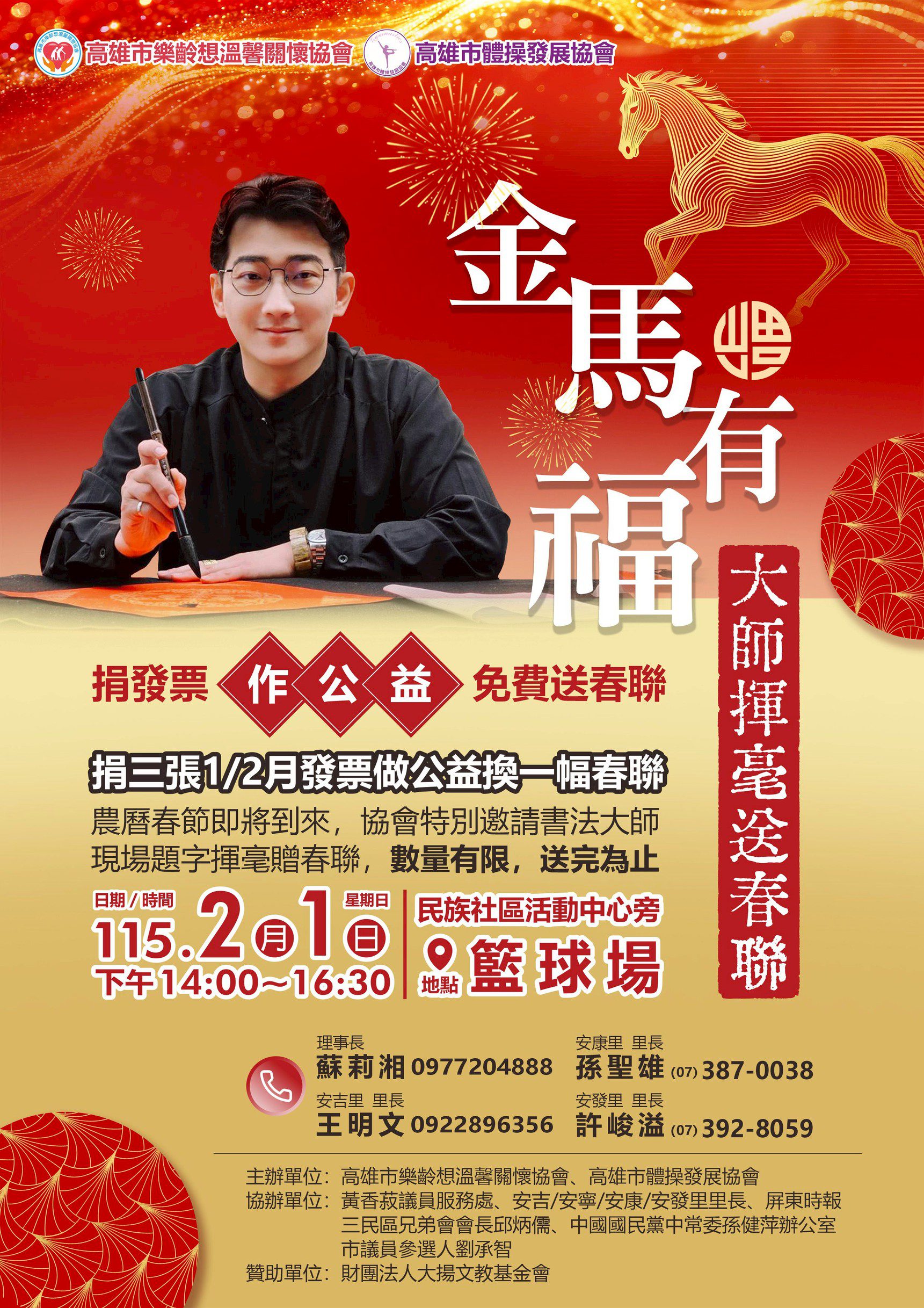 【記者蘇莉湘 ∕ 高雄報導】 迎接農曆新年的到來,高雄市樂齡想溫馨關懷協會攜手高雄市體操發展協會,將於 2 月 1 日(星期日)下午 2 時至 4 時 30 分,在 民族社區活動中心旁籃球場 舉辦「金馬有福・大師揮毫送春聯」公益活動,邀請民眾以捐贈發票方式行善迎新春。
