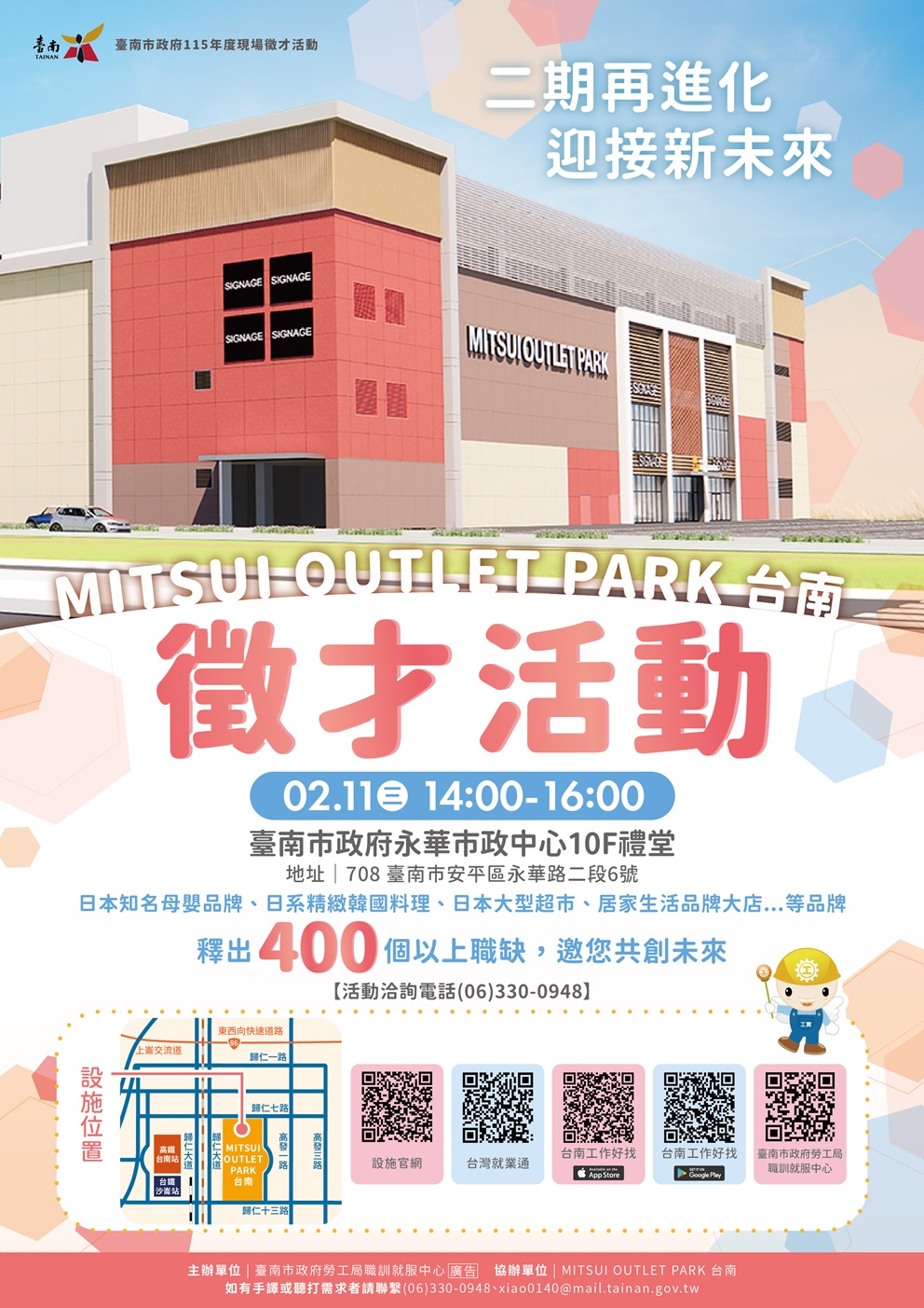 115/02/11(三)勞工局職訓就服中心辦理『MITSUI OUTLET PARK台南』店舖聯合徵才活動,歡迎求職民眾踴躍參加