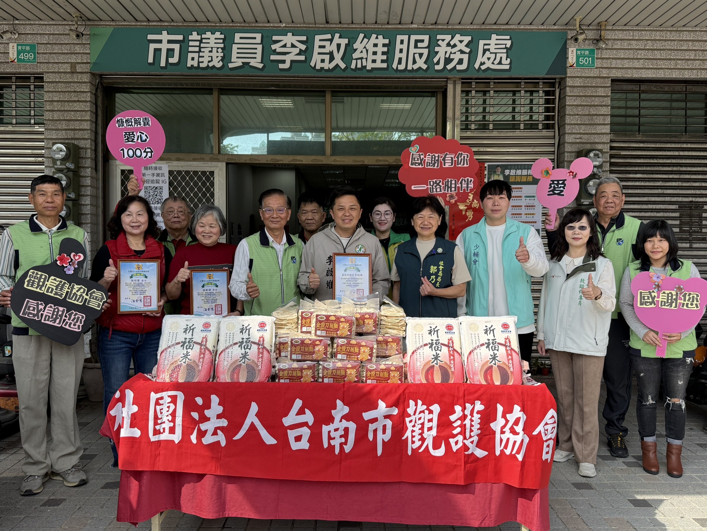 春節將至!為關懷弱勢非行少年及其家庭,市議員李啟維服務處邀各界善心人士及熱心企業,共同捐助逾千公斤米麵及9萬元給社團法人台南市觀護協會,今(27)日上午在安平區李啟維議員服務處舉行捐贈儀式,社會局長郭乃文特別到場見證,由觀護協會理事長江金忠、秘書長劉文欽及多位理事代表受贈,場面溫馨感人。