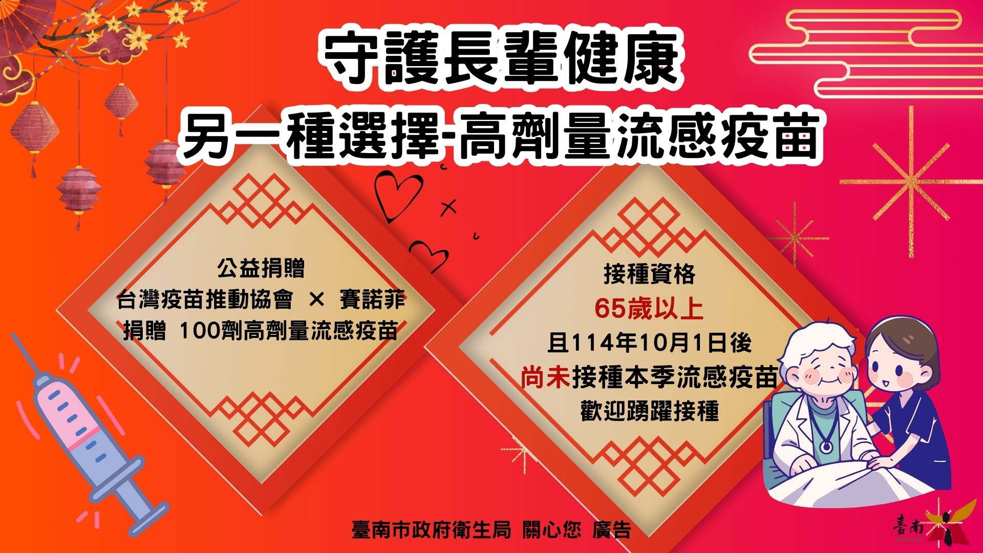 臺南市政府感謝台灣疫苗推動協會攜手賽諾菲股份有限公司,公益捐贈100劑高劑量流感疫苗,本市結合臺南市醫師公會及診所協會共同推動,提供本市65歲以上長者免費接種,展現公私協力守護高齡健康的具體行動。