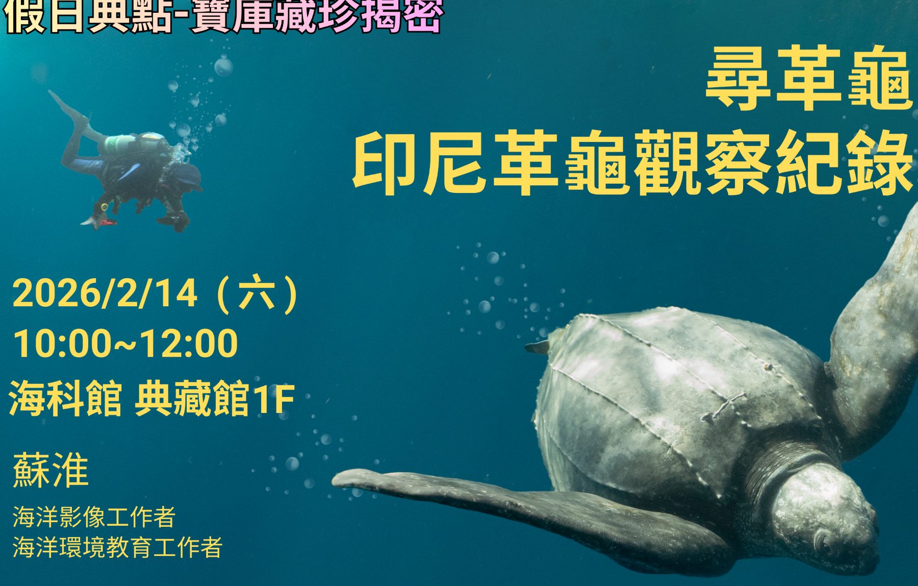 海科館表示於每月第二週末舉辦的「寶庫藏珍揭密」系列講座,邀請不同領域的研究者與實務工作者,帶領民眾走進博物館典藏背後的科學故事與文化記憶。年度首場講座「雙髻鯊生物與保育」由長期投入鯊魚研究與海洋保育工作的徐華遜博士主講,引發熱烈迴響與吸引許多民眾到場聆聽座無虛席,展現大眾對大型海洋生物與保育議題的高度關注。主講內容聚焦於雙髻鯊的生態角色與保育挑戰,不僅熱烈互動及討論,也為「寶庫藏珍揭密」系列演講揭開序幕。而第二場講座將由素有「海龜癡漢」的海洋影像工作者蘇淮老師,以知性與故事性的方式,帶領民眾走進另一種同樣瀕臨威脅、卻更神秘罕見的海洋巨型生物──革龜,並帶民眾探索世界上僅存有哪些海龜,而原為旱鴨子的蘇淮老師如何蛻變成海洋環境與生態保護者以及與海龜的故事。