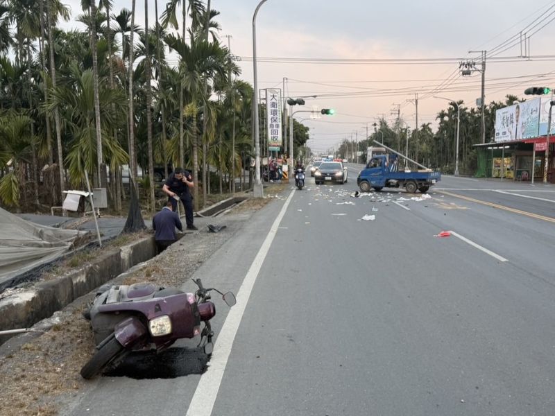 【記者何勁陞/里港報導】 屏東縣鹽埔鄉新埔路與仕絨路口於(27)日17時許發生一起嚴重交通事故,一名44年次傅姓婦人騎乘普通重型機車依號誌直行時,遭一輛自小客車闖紅燈撞擊,婦人當場重傷送醫,經搶救2小時仍宣告不治,肇事車輛事故後逃逸,涉犯肇事逃逸罪嫌。