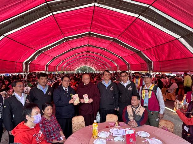農曆春節即將來臨,台南左鎮區洋溢濃濃年味,今(8)日由台南左鎮噶瑪噶居寺、財團法人台南市私立噶瑪噶居蔣揚社會福利慈善事業基金會及社團法人台南市噶瑪噶居戒癮協進會攜手辦理「佛祖請吃飯 歲末送暖」慈善活動,邀請左鎮、玉井、楠西及南化等4區之低、中低收入戶、玉井社福中心列案弱勢家庭邊緣戶、弱勢身障福利團體及社區兒少關懷據點弱勢兒童,共計1,200位弱勢民眾一起來圍爐,受邀前來的弱勢家戶除品嘗辦桌佳餚外,每人可領有2,000元的福田關懷金,及1盒毛帽組合禮盒,讓弱勢民眾在春節前夕感受到社會的溫暖與支持,黃偉哲巿長在社會局郭乃文局長、左鎮區長李燿州陪同下出席,並親自頒發感謝狀,表達對長期投入公益及社會福利工作的肯定,感謝狀由蔣揚社會福利慈善事業基金會董事唐一佑,以及噶瑪噶居寺掌堂張智欽代表受贈。市議員周奕齊,立委陳亭妃、郭國文服務處及各議員服務處均到場參與。