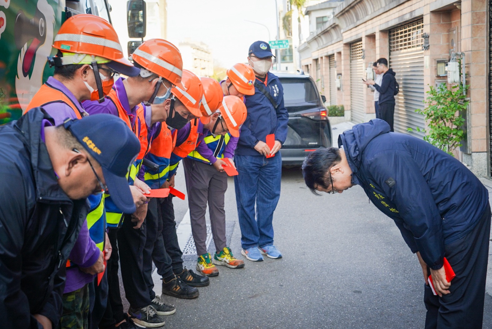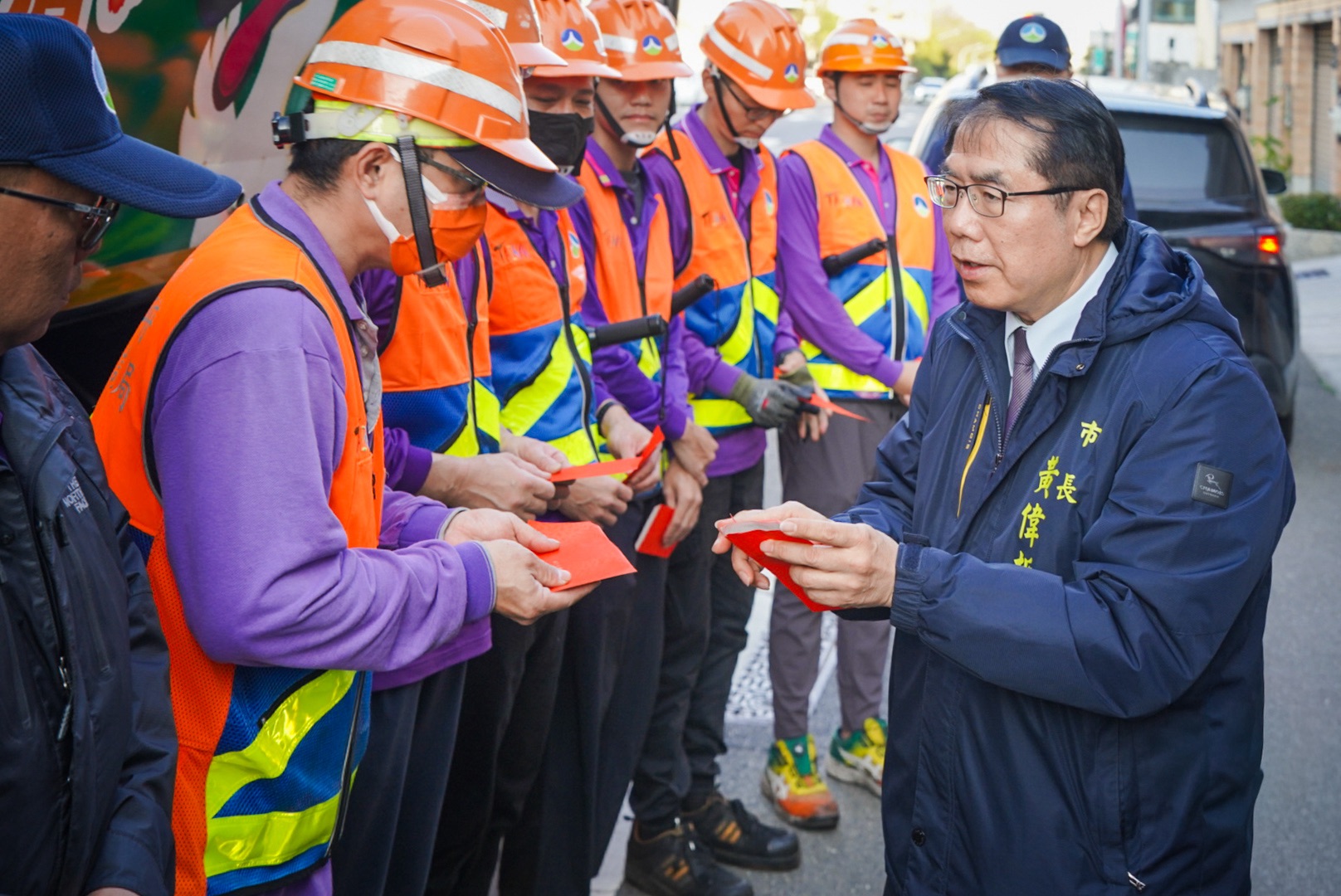 黃偉哲市長下午分別到東區及南區兩處垃圾收運點,發紅包給清潔隊員並拜早年。正在執行清運工作中的清潔隊員,領到市長發放的新春紅包都相當開心,視為新春好采頭。