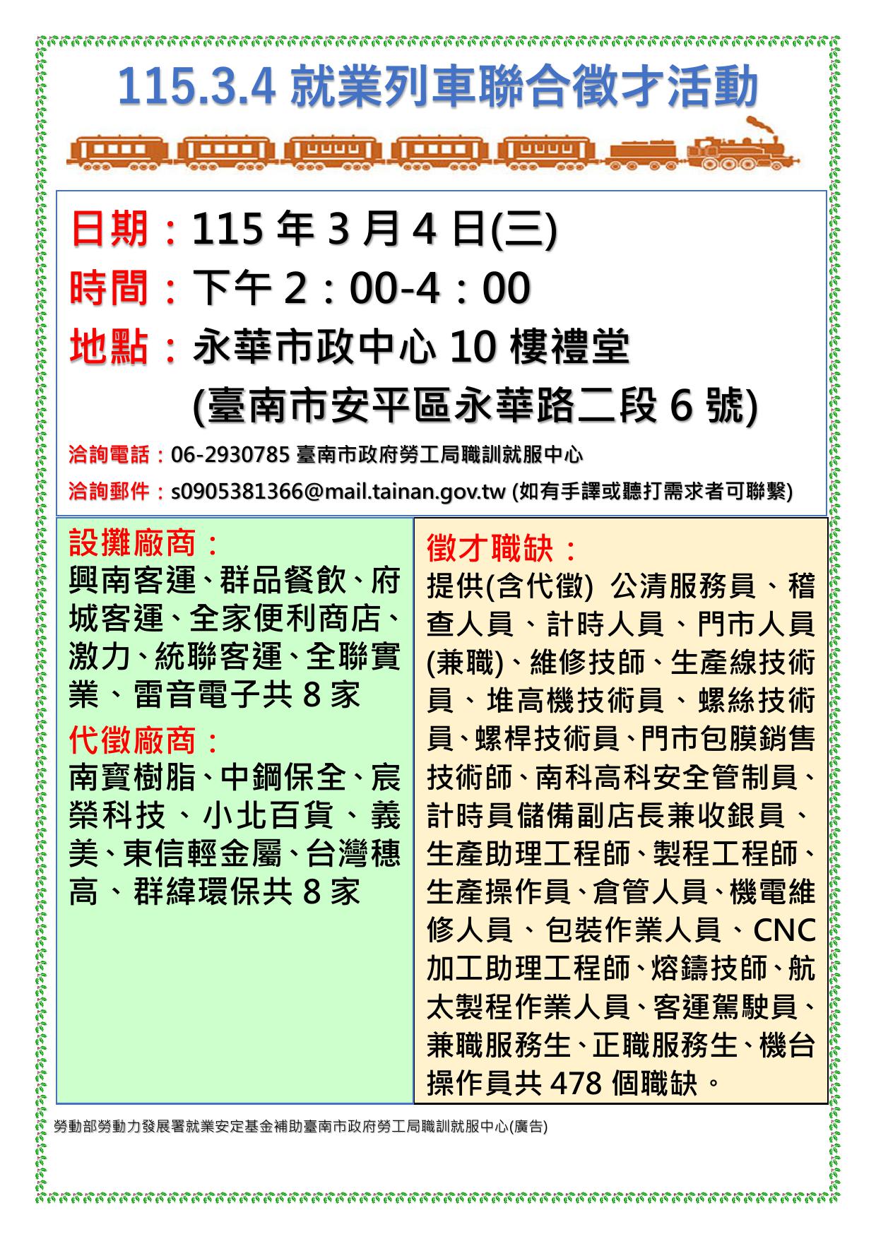 為打造黃偉哲市長「希望家園」的施政願景,勞工局積極辦理各項就業徵才活動,並因應產業求才需求,勞工局職訓就服中心將於115年3月4日(週三)下午2時至4時在永華市政中心10樓禮堂(臺南市安平區永華路二段6號)辦理「115.3.4就業列車聯合徵才活動」,邀請16家廠商提供478個職缺,歡迎求職民眾踴躍前往參加,洽詢電話:06-2930785。