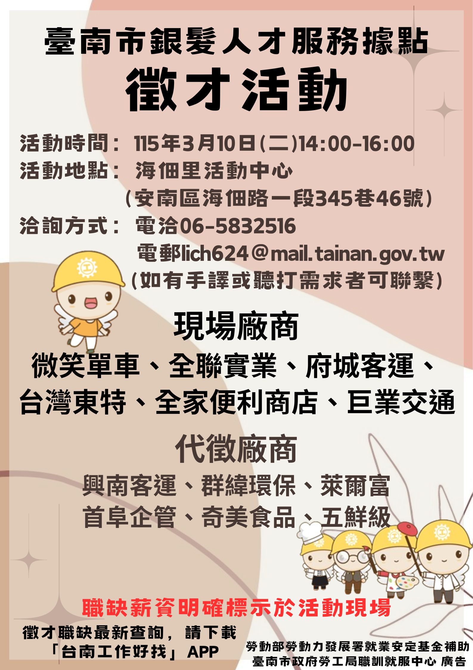 本次徵才活動邀請:微笑單車股份有限公司、全聯實業股份有限公司、府城汽車客運股份有限公司、台灣東特股份有限公司、全家便利商店股份有限公司、巨業交通股份有限公司等6家現場廠商,提供維調專員、維調駕駛計時人員、門市人員(正職/兼職/儲備幹部)、客運駕駛、調度員、兼職夜間充電員、車安人員、技術人員、作業員、生產管理人員、設備人員等102個職缺。代收履歷廠商有興南汽車客運股份有限公司、群緯環保工程有限公司、萊爾富國際股份有限公司、首阜企業管理顧問股份有限公司、奇美食品股份有限公司、五鮮級國際餐飲股份有限公司等6家提供113個職缺,當日總共提供215個工作機會,歡迎活動當日親洽現場投遞履歷參加面試,活動職缺之薪資明確標示於徵才現場。