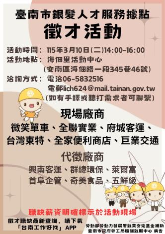 為打造黃偉哲市長「希望家園」的施政願景,勞工局積極辦理各項就業徵才活動,並因應產業求才需求,臺南市銀髮人才服務據點將於3月10日(二)下午2點至4點舉辦聯合徵才活動,地點於海佃里活動中心(臺南市安南區海佃路一段345巷46號),邀請12家廠商提供215個職缺,歡迎求職民眾踴躍前往參加,洽詢電話:06-5832516。