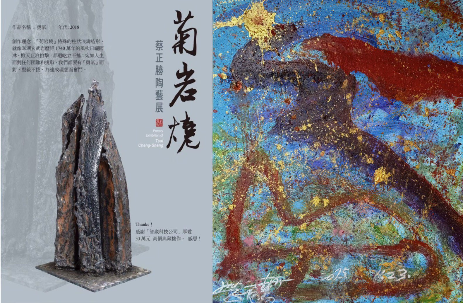 蔡正勝老師獨創的作品,運用故鄉菊島的岩礦砂泥,蘊育生出獨特的「菊岩燒」系列作品;它外獷內柔、粗獷豪邁,帶著濃濃的故鄉味,猶如生活體驗和生命體悟的寫照,勇敢面對生命逆境,夫婦一起相互扶持抗癌,努力活出精彩人生的感人故事,「台灣超人」借由鏡頭,拍成電影⋯