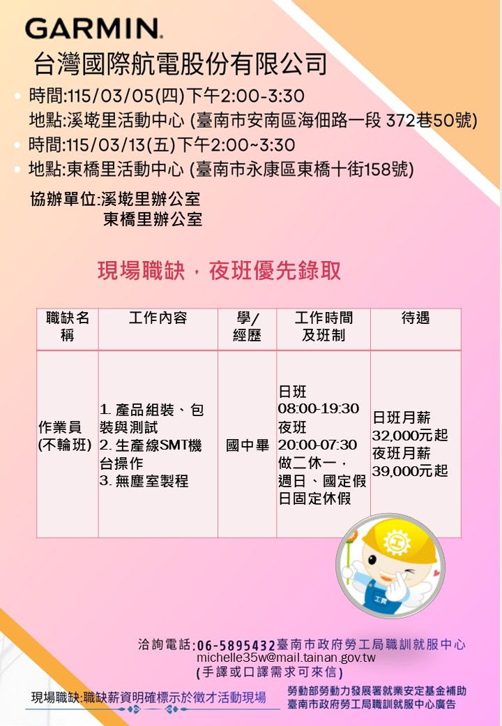 為打造黃偉哲市長「希望家園」的施政願景,勞工局積極辦理各項就業徵才活動,並因應產業求才需求,勞工局職訓就服中心將於115年3月05日(週四)、下午2點至3點30分在溪墘里活動中心(臺南市安南區海佃路一段372巷50號)、115年3月13日(週五)下午2點至3點30分在東橋里活動中心(臺南市永康區東橋十街158號)辦理GARMIN_台灣國際航電股份有限公司徵才活動,提供日/夜班作業員共100名(應徵夜班作業員優先錄取),歡迎求職民眾踴躍前往參加,洽詢電話:06-5895432。