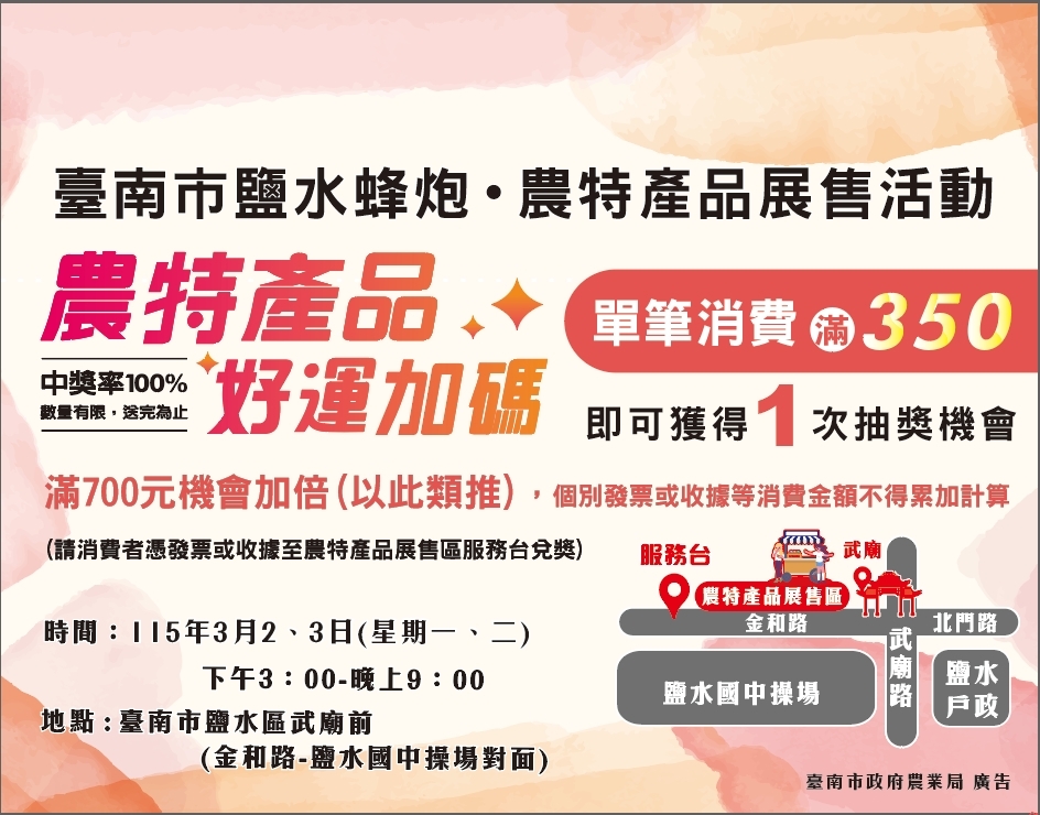 此外,為臺南夜晚增添震撼魅力的「鹽水蜂炮」同樣精彩可期。活動期間每日下午3時至晚間9時,市府於鹽水區武廟前(金和路—鹽水國中操場對面)同步辦理消費抽獎活動,凡單筆消費滿350元,即可獲得1次抽獎機會,豐富的農特產品好禮送完為止。市府邀請民眾白天漫步蘭展體驗科技美學,夜晚走訪鹽水老街感受蜂炮文化與熱鬧元宵氛圍,深度體驗臺南的日夜精彩。
