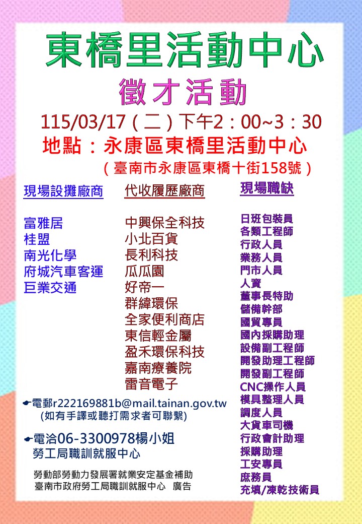 115/03/17(二)勞工局職訓就服中心辦理永康區東橋里活動中心廠商聯合徵才活動 歡迎求職民眾踴躍參加