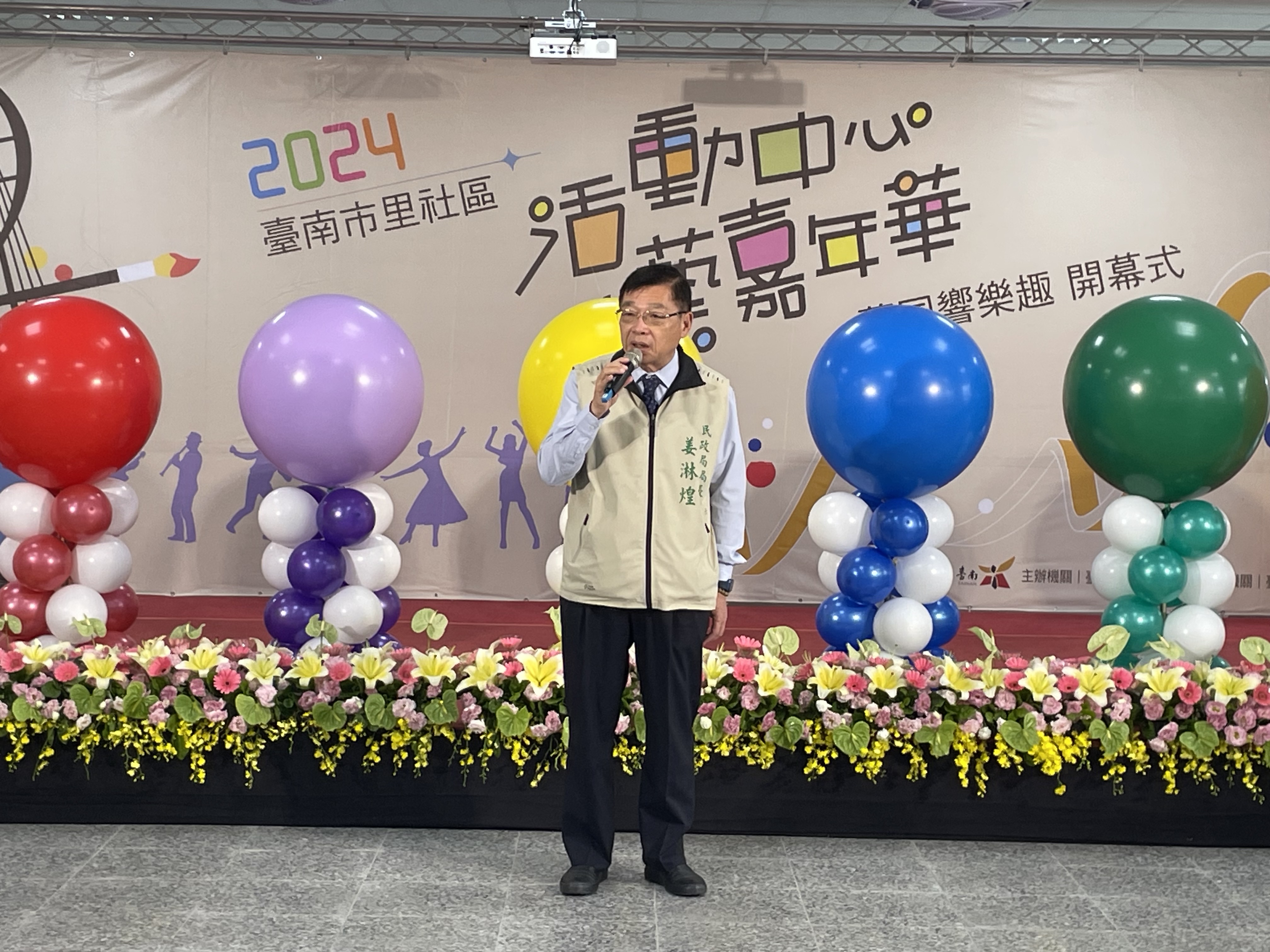 由臺南市政府民政局辦理的「2024臺南市里社區活動中心才藝嘉年華開幕式」,今(1)日在永康區多功能活動中心由民政局長姜淋煌與各區長、地方民意代表一起為活動揭開序幕。