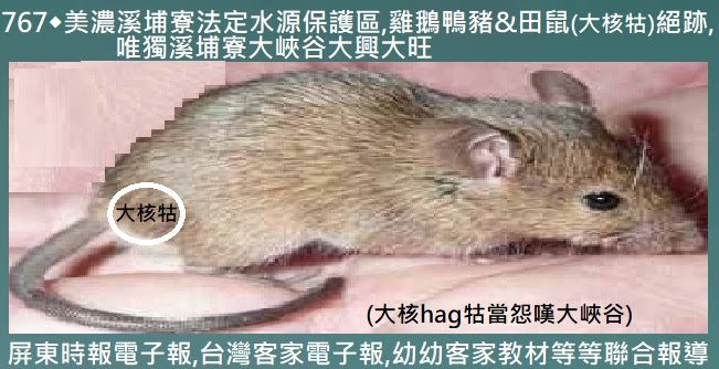 這下老鼠族群自從將[美濃溪埔寮地區]劃為[水源保護區]以後,產生當多断糧断食的問題,現下又開挖iadˋ恁多[大峽谷(Grand Canyon)]同𠊎ngaiˇ(大核牯:Big Testicle Rat )名音相像;將[美濃溪埔寮大峽谷]壞名聲,連累喊成[美濃溪埔寮大核hag牯guˋ]啊vaˋ!