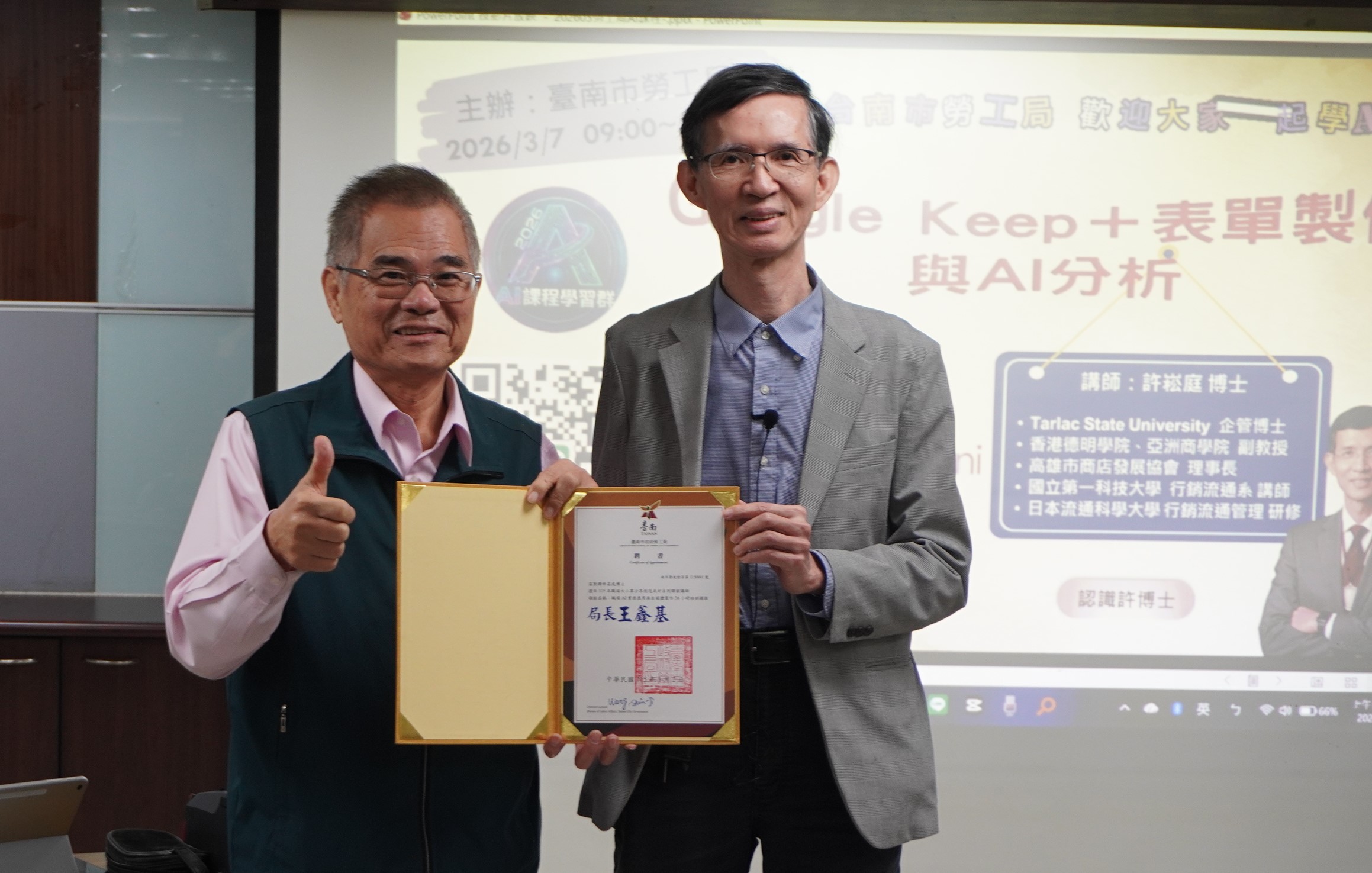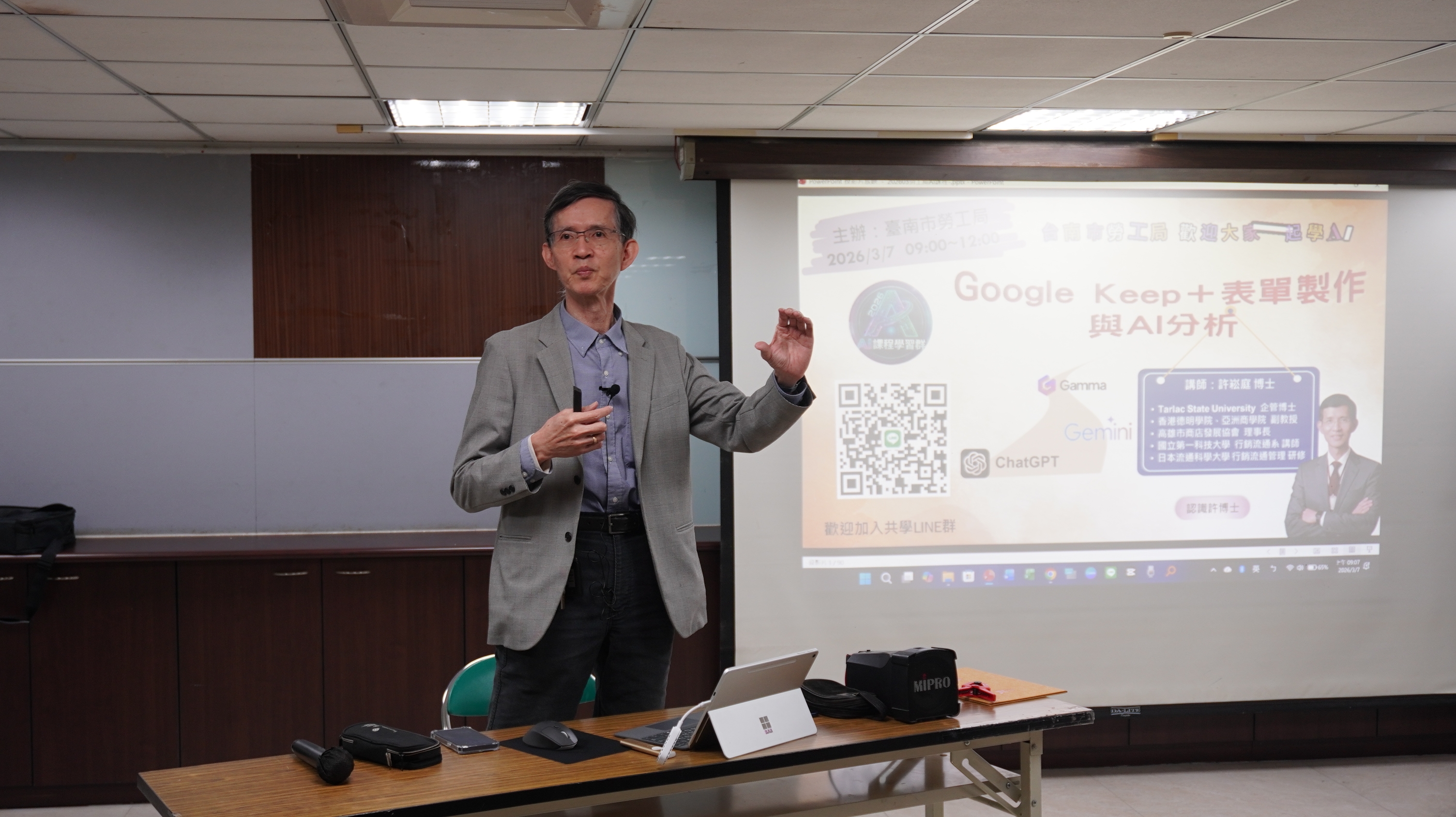 南市勞工局持續推動終身學習,鼓勵勞工朋友精進專業能力,面對數位轉型與AI應用快速發展的趨勢,115年職場大小事講座邀請許崧庭博士授課,以「職場AI實務應用與自媒體製作」規劃36小時系列課程,今(7)日第三堂教學內容為「Google Keep+表單製作與AI分析:建立靈感筆記庫;AI分析問卷與摘要」,帶領學員從日常工作情境出發,學習AI工具應用於資料蒐集、整理、分析到行動,並形成一套可複製的工作流程。