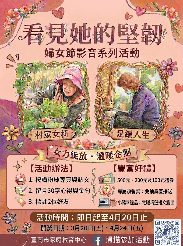 響應3月8日國際婦女節,臺南市家庭教育中心策劃「看見她的堅韌」影音系列活動,透過將紀錄片重新剪輯、轉譯的創新手法,不僅是向女性致敬,更是一場深度的數位平權對話。即日起至4月20日,邀請市民朋友透過線上影展,在短時間內深入體會女性突破框架的生命力,並藉由社群互動,共同編織出一份屬於臺南的溫暖女力記憶。