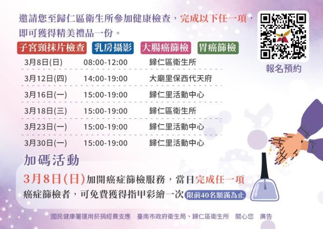 為響應3月8日國際婦女節,鼓勵女性朋友重視自身健康,臺南市政府衛生局於115年3月8日上午在歸仁區衛生所舉辦「寵愛自己 健康美麗同行」癌症篩檢活動,吸引本市多位符合資格的女性朋友踴躍參與,現場氣氛溫馨熱絡,在健康與美麗兼具的氛圍中圓滿完成,提供近300人次的癌症篩檢服務。