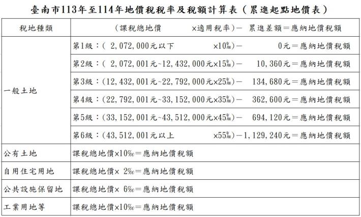 該局進一步指出,地價稅係按每一土地所有權人在同一直轄市或縣(市)轄區內全部土地之地價總額,採累進稅率課徵。因此,今年土地所有權人在臺南市轄區內全部土地的地價總額未超過累進起點地價207萬2,000元者,其地價稅按基本稅率10‰課徵;超過累進起點地價者,再依超過倍數按15‰至55‰稅率課徵。