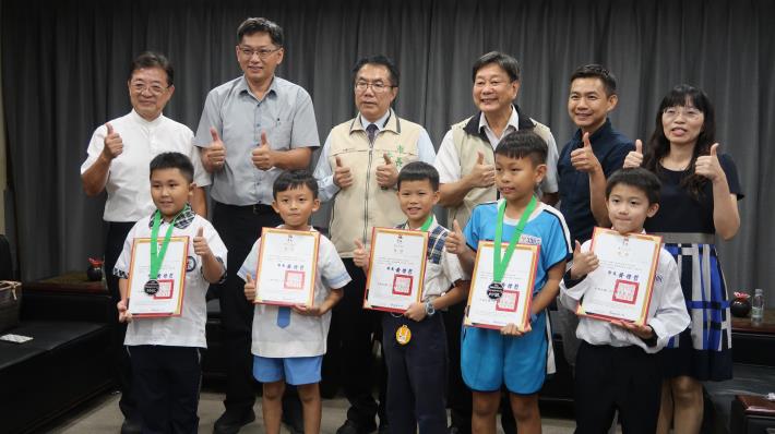 臺南市機器人教育發展蓬勃,永福國小黃章宸及吳育賢、永信國小蘇淙彧、永康國小王子洋、寶仁國小汪靖閔等5位學生組成聯隊,4月赴美國休士頓(Houston)參加FIRST 2024 Championship國際機器人競賽,在樂高聯賽探索組(FLL Explore)比賽中榮獲最佳解決方案獎(Challenge Solution Award),表現優異,黃偉哲市長今(11)日於市府接見表揚,除了恭喜獲獎同學外,也期勉持續保有熱忱,成為科技人才。