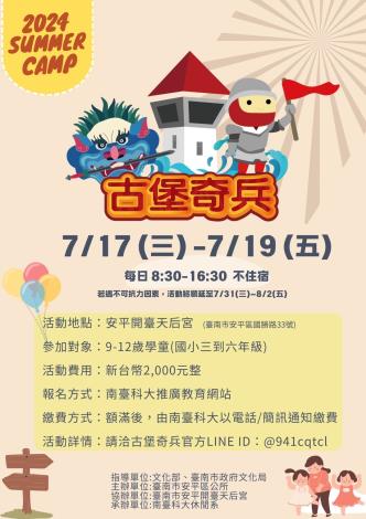 今年第四屆的「古堡奇兵」夏令營訂於7月17日至19日(週三至週五)辦理,為期3天,於安平開台天后宮舉行。本次營隊課程以響應2024年「臺南400」為主題,課程精彩豐富,包含雙層巴士遊覽臺南歷史街區、機智團康遊戲、廟宇文化導覽及劍獅彩繪體驗等多項課程,藉由課程的安排將小學員化身為古堡小奇兵進行分組,完成三天的活動課程,引發小學員之間的興趣完成課程的任務目標,發揮團隊精神攜手過關斬將完成活動目標,創造領導特質,並且結交新朋友提升人際關係與協調能力,學習安平在地的知識與文化。