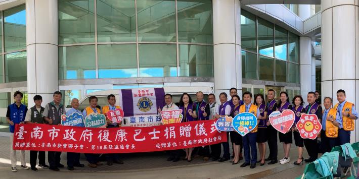 為響應臺南市照顧弱勢優先的施政理念,新豐獅子會於111年及今(113)年3月各捐1輛復康巴士,本(7)月阮連通會長用實際行動支持身障朋友,再度捐贈1輛價值百萬元復康巴士,累計已捐贈3輛復康巴士。今(2)日下午社會局於永華市政中心2樓廣場舉辦捐贈儀式,黃偉哲市長親自出席代表接受,並回贈感謝狀給阮連通會長,2024-2025國際獅子會300E-1區曾澎英總監、新豐獅子會謝旭明會長和所有與會的獅友,以及林俊憲立委、周家韋議員、蔡宗豪議員服務處代表都到場參與見證。