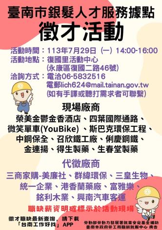 為打造黃偉哲市長「希望家園」的施政願景,勞工局積極辦理各項就業徵才活動,並因應產業求才需求,臺南市銀髮人才服務據點將於7月29日 (一)下午2點至4點舉辦聯合徵才活動,地點於復國里活動中心(臺南市永康區復國二路46號),邀請18家廠商提供207個職缺,歡迎求職民眾踴躍前往參加,洽詢電話:06-5832516。