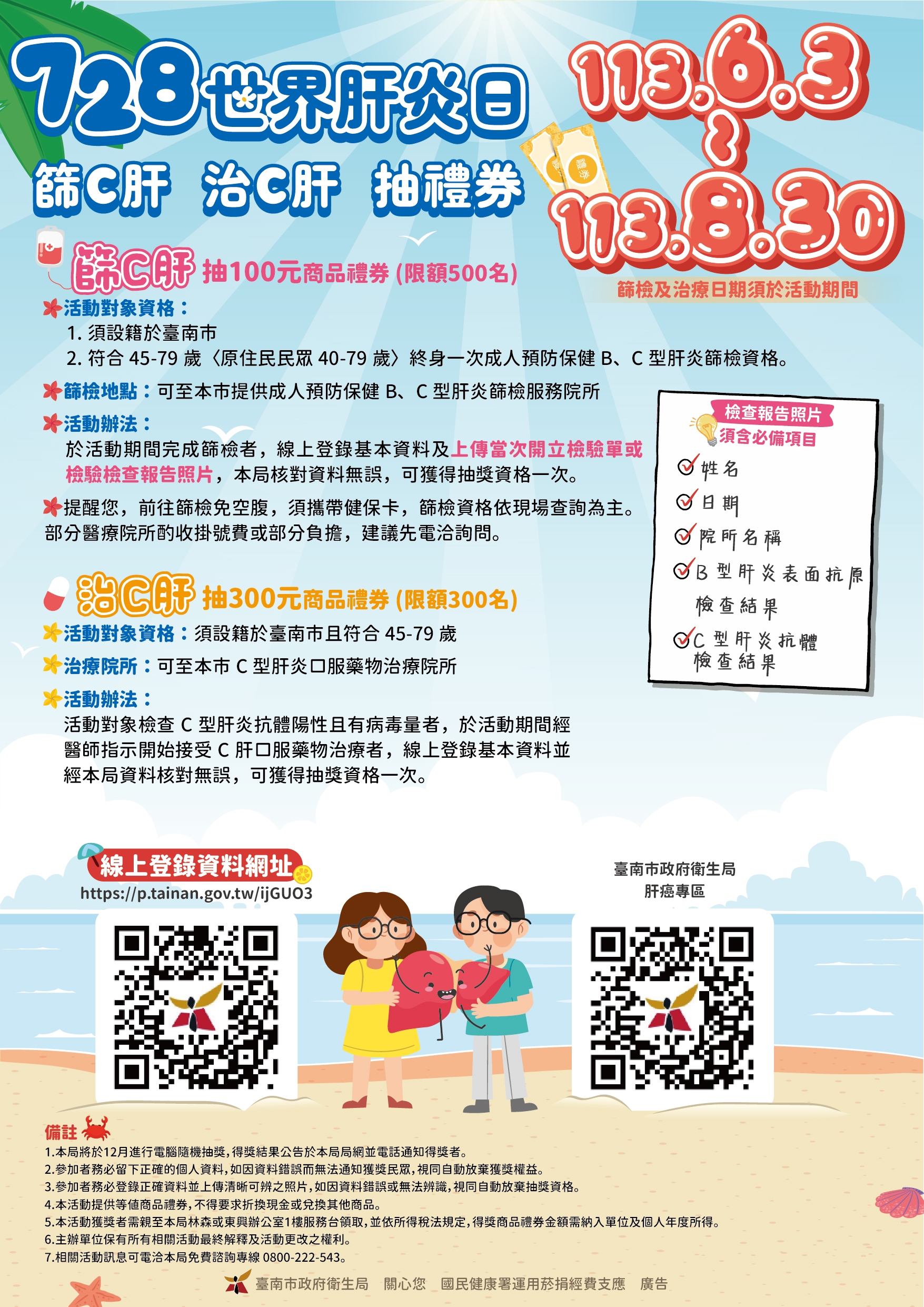 為響應7月28日世界肝炎日,臺南市政府衛生局特別辦理「篩C肝 治C肝」抽禮券活動,凡是設籍臺南市45至79歲未做過公費成人預防保健B、C型肝炎篩檢的市民朋友,於活動期間113年6月3日至8月30日完成篩檢,將抽出500位幸運兒,可獲得100元商品禮券。若是檢驗C型肝炎陽性且有病毒量者,於活動期間接受C型肝炎口服治療,加碼抽出300位幸運兒,可獲得300元商品禮券,最高可獲得400元禮券。