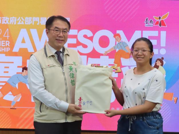 黃偉哲市長特別準備臺南400簽名紀念提袋,送給首位報名實習生青年設計松的金門大學李孟昀同學,同時也鼓勵所有實習生一起來關心公共事務。李同學表示希望藉此機會增加對公共議題的參與度,透過自身創意和想法為台南市發展與進步貢獻一份力量。青年設計松不僅提供學生展現所學知識的平台,也讓市府更了解青年世代的觀點,進一步推動政策創新、激發更多靈感與思維。