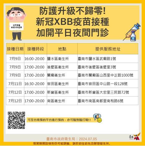 為守護市民朋友的健康,避免在感染新冠後造成重症和死亡,南市37區衛生所持續加開夜間或假日疫苗門診提供接種服務,請尚未接種過XBB疫苗之市民朋友善加利用,盡快前往接種;另外,65歲以上長者、55-64歲原住民、出生滿6個月以上有免疫不全以及免疫力低下的高風險對象,接種第1劑且間隔12週(84天)後可再接種第2劑以增強保護力,降低重症或死亡發生。民眾可至臺南打疫苗預約平台( https://health-reservation.tainan.gov.tw/covid )進行預約,亦可至37區衛生所或合約院所隨到隨打。