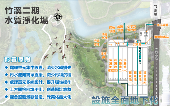 為擴大竹溪水質改善範圍,水利局於111年向環境部爭取水質改善經費,獲環境部核定補助1,974萬元辦理竹溪水質淨化場第二期工程規劃設計計畫,規劃設計一處水質淨化場以截流處理竹溪排水,透過接觸曝氣及沉澱處理單元去除水中有機物及懸浮固體物,再將淨化後的水補注回竹溪上游,改善竹溪水質及竹溪橋下游周邊環境。規劃內容更融入低碳概念,以AI0T系統利用水質偵測器即時監測進流水質,藉以調控鼓風機設備,達到節省能耗及操作優化成效。目前水利局已完成細部設計,預計工程經費約4.6億元,刻正向環境部爭取工程經費中。
