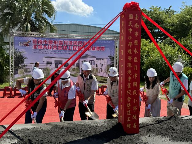 月津國小北棟A校舍整建工程動土奠基典禮於今(10)日上午在學生臺灣獅隊鑼鼓喧天的精采演出與社區家長的熱情祝賀聲中揭開序幕,臺南市長黃偉哲、教育局鄭新輝局長、校友會理事長蔡瑞頒醫師、議員王宣貿、沈家鳳、李宗翰、蔡育輝及家長、社區民眾與師生觀禮下進行動土典禮,以「月津展藝」為特色的嶄新校舍預計於114年11月完工。