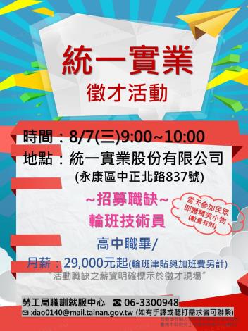 為打造黃偉哲市長「希望家園」的施政願景,勞工局積極辦理各項就業徵才活動,並因應產業求才需求,勞工局職訓就服中心將於08月07日(週三)09時至10時在統一實業股份有限公司(臺南市永康區中正北路837號)辦理廠內徵才活動,提供輪班技術員20個職缺,歡迎求職民眾踴躍前往參加,洽詢電話:06-3300948。