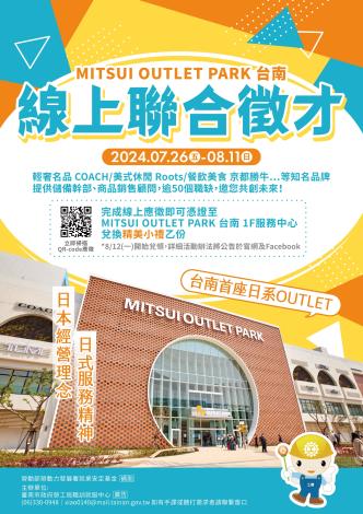 為打造黃偉哲市長「希望家園」的施政願景,勞工局積極辦理各項就業徵才活動,並因應產業求才需求,勞工局職訓就服中心將於即日起至8/11(日)止辦理『MITSUI OUTLET PARK 台南-PART 2』線上徵才活動,邀請9家廠商提供50個職缺,另,完成線上應徵者提供精美小禮(每人限兌換一次),8/12(一)開始憑有效證件(身分證/健保卡/駕照)至MITSUI OUTLET PARK 台南 1F服務中心兌換,兌換至9/1(日)止,歡迎求職民眾踴躍前往參加,洽詢電話:06-3300948。