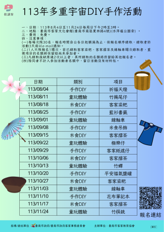 - 1人只限報名1埸次,若已錄取客家粢粑、客家擂茶及線軸車埸次錄取者,重複項目的名額將保留給尚未參加者。